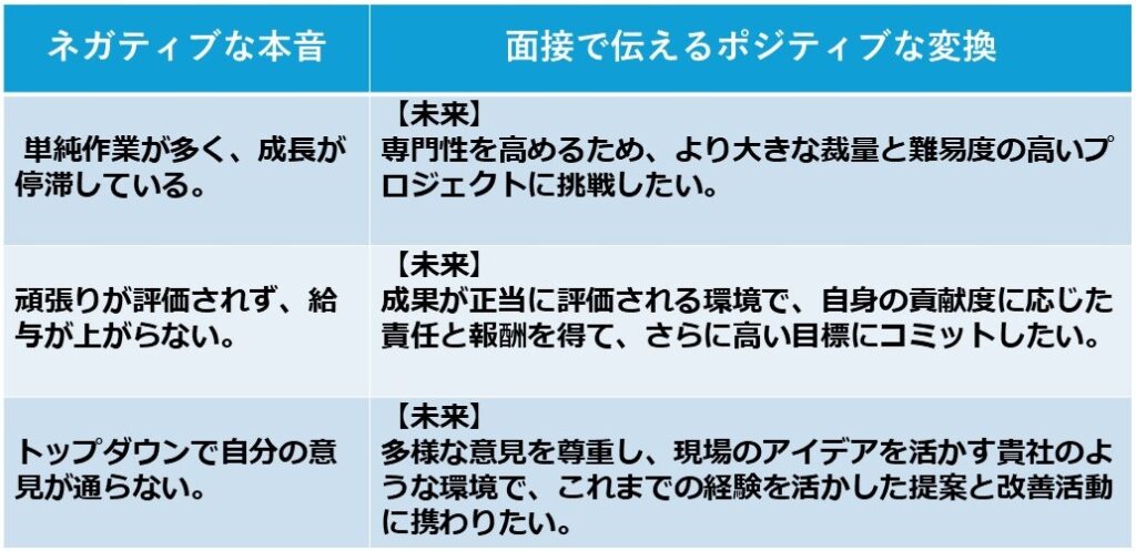 転職理由は、過去への不満ではなく、未来への希望と目標を語るべきです。